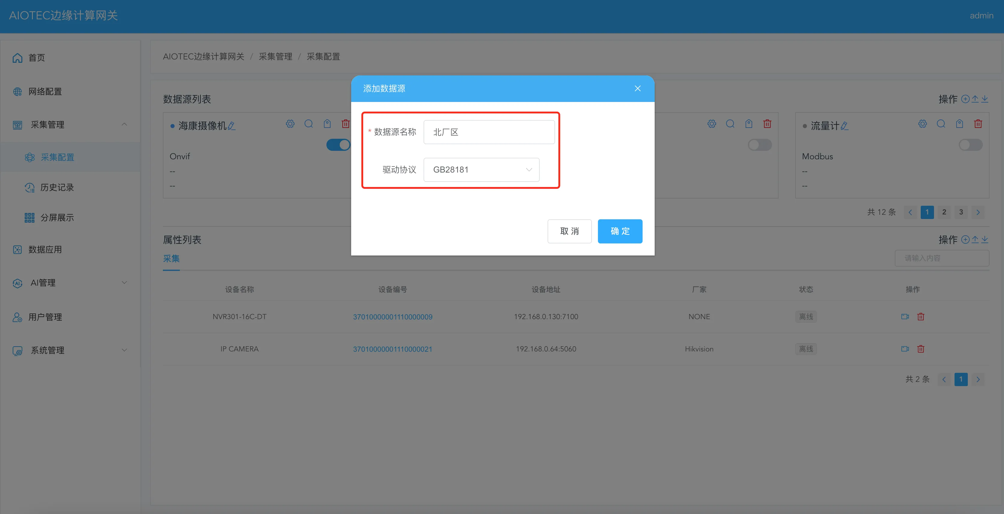 添加数据源 → 输入数据源名称及选择 GB28181,点击确认。